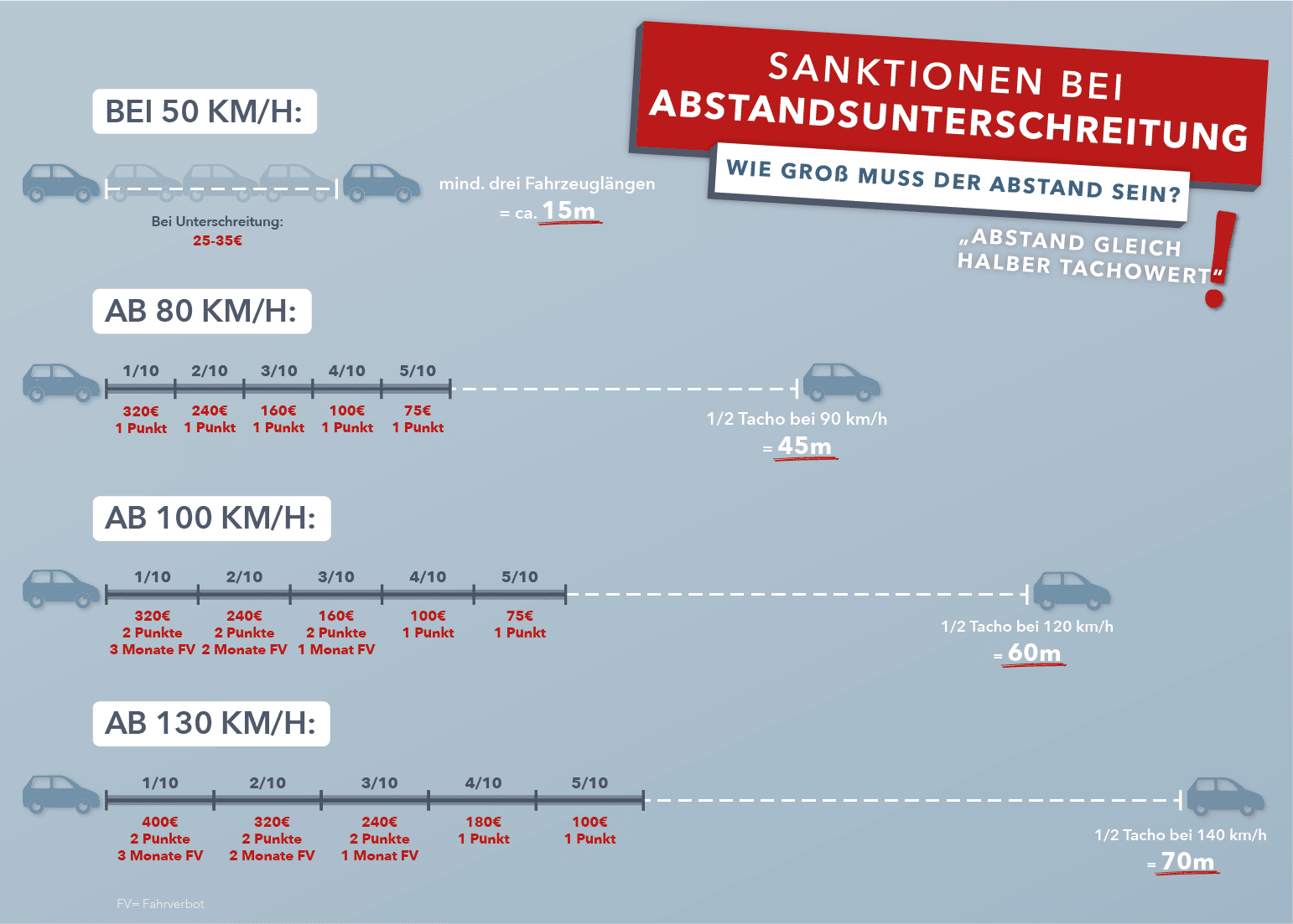 Faustregel um den Mindestabstand zu berechnen: Mindestabstand gleich halber Tachowert. Das bedeutet, dass bei guten Witterungsverhältnissen 25 Meter Sicherheitsabstand bei einer Geschwindigkeit von 50 km/h oder 50 Meter Sicherheitsabstand bei einer Geschwindigkeit von 100 km/h einzuhalten sind.