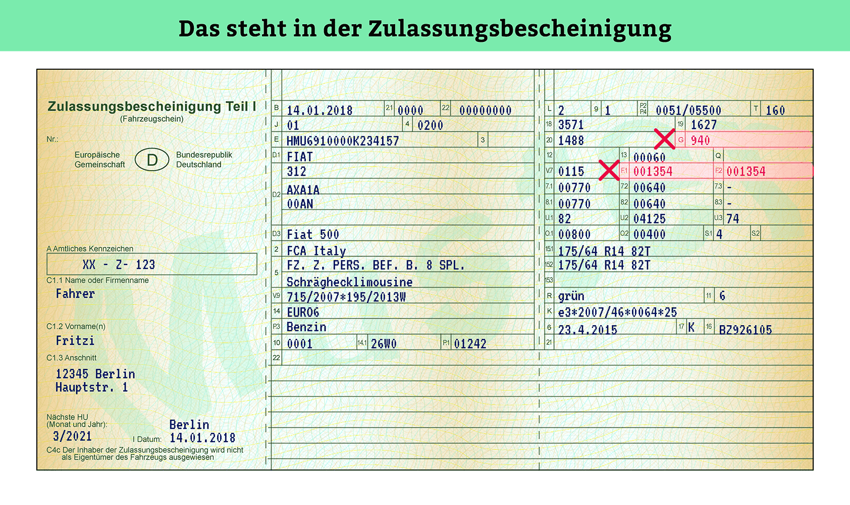 Diese Regel gilt selbstverständlich auch dann, wenn Ihr Auto statt der neuen Zulassungsbescheinigung Teil 1 noch einen alten Fahrzeugschein besitzen sollte.