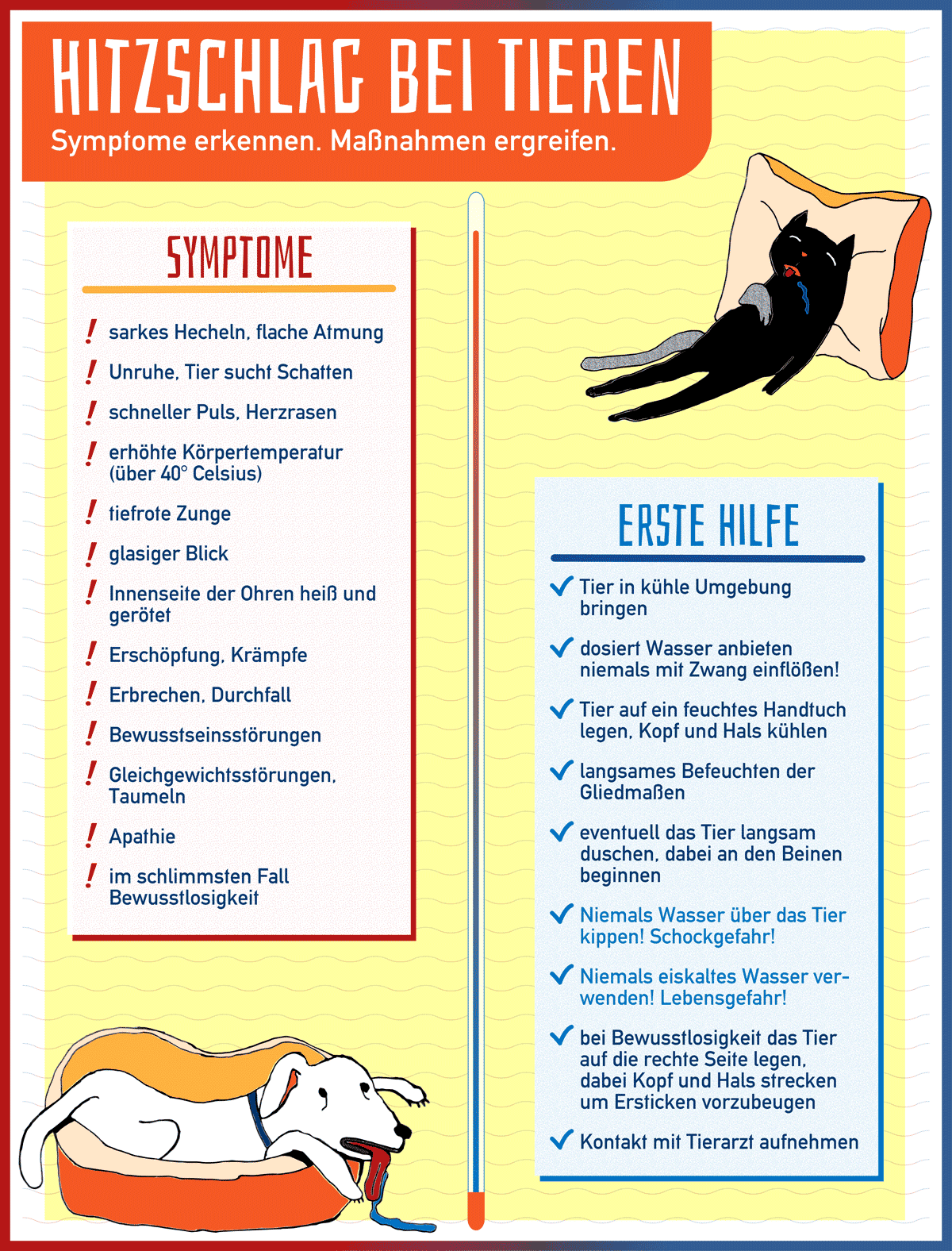 | Die Grafik zeigt, wie Sie einen Hitzschlag bei Tieren erkennen und Erste Hilfe bei Tieren leisten können. |