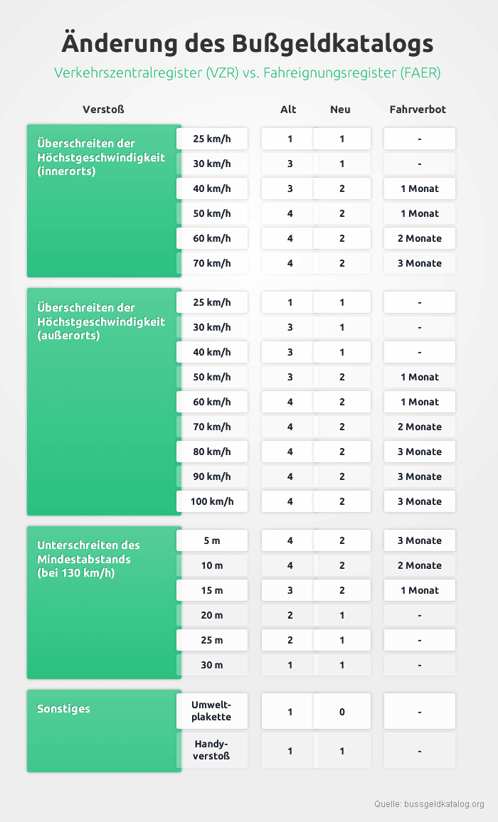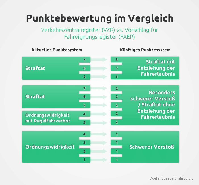 | Infografik über Tilgungsfristen: Auf der Grafik ist zu sehen, welche Tilgungsfristen im alten Punktesystem bestanden, welche es im neuen System gibt und wie sich die Tilgungsfristen durch die Punktereform geändert haben. |