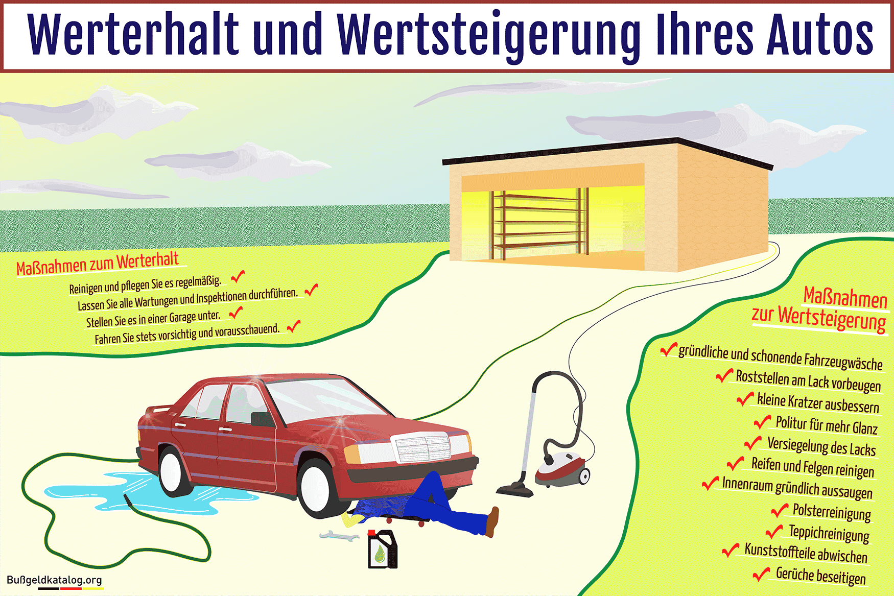 Infografik: Maßnahmen zum Werterhalt und zur Wertsteigerung Ihres Autos auf einen Blick (Zum Vergrößern klicken).