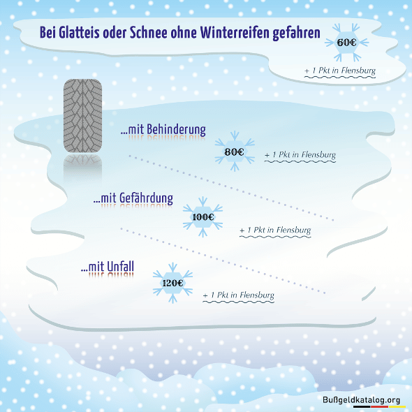Diese Gefahren veranlassten den Gesetzgeber zum Entwurf eines Bußgeldkatalogs, der für Geschwindigkeitsüberschreitungen im Winter besonders hohe Strafen vorsieht. Ein Beispiel aus der Bußgeldtabelle soll dies verdeutlichen: