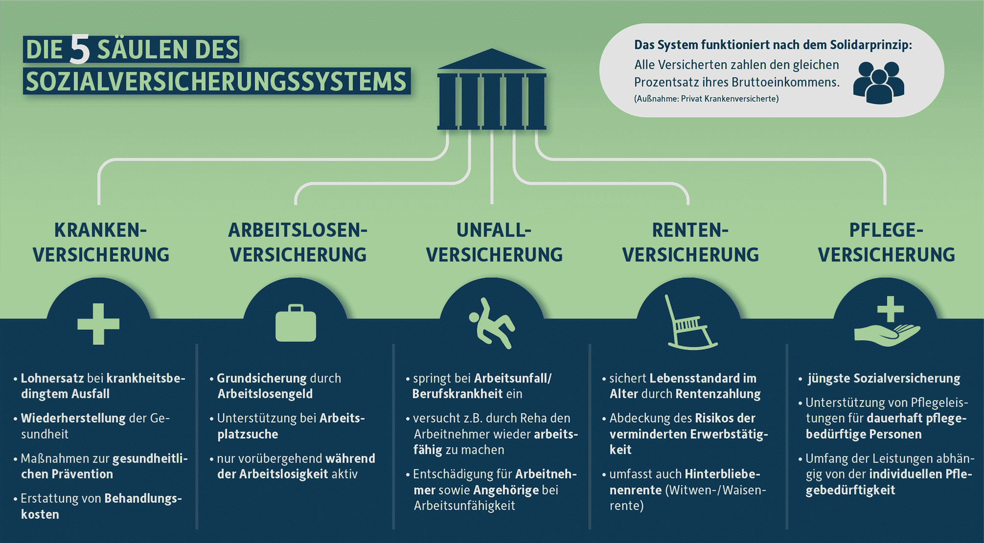 Infografik: Die 5 Säulen der Sozialversicherung und deren Funktionen